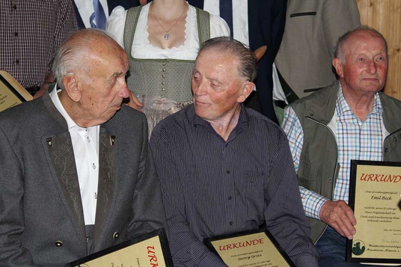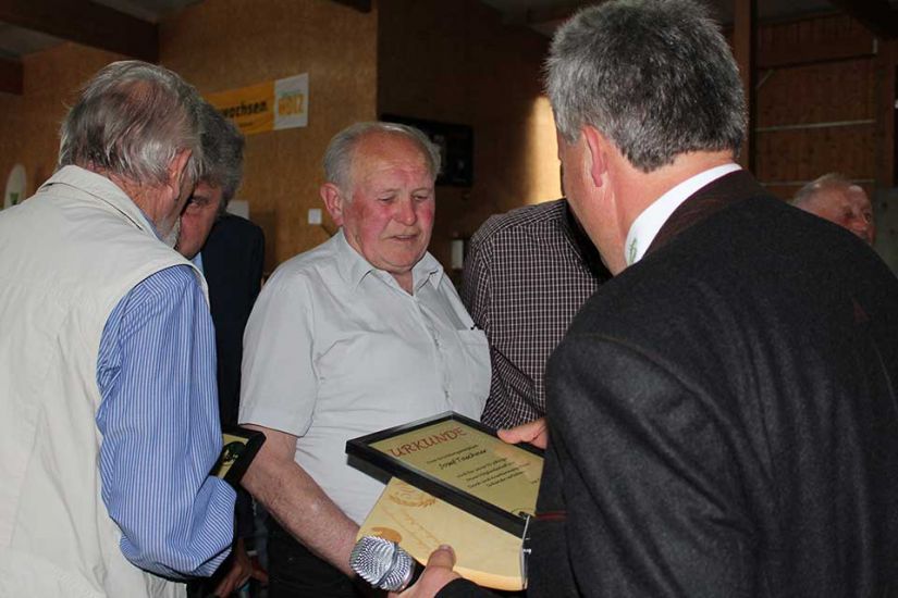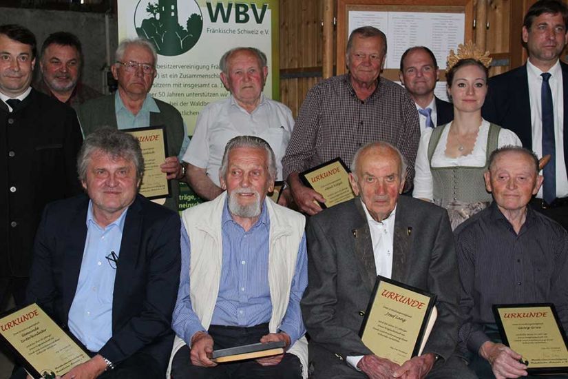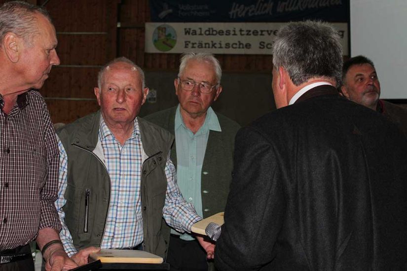 Anerkennung erhielten an dem Jubiläumsabend auch die Gründungsmitglieder der WBV Fränkische Schweiz. Die Herren traten sichtlich stolz nach vorne und nahmen ihre Ehrenurkunden entgegen. Wie sich die WBV in den Jahren entwickelt hatte, erzählte Forstamtsrat Erwin Bittermann. Die gemeinsame Bewirtschaftung der oberfränkischen Wälder sollte reibungslos ablaufen, weshalb die Mitglieder der WBV damals Ortsverbände und ein Obmannsystem schufen, das auch heute noch besteht. Die Obmänner und Verbände standen den Waldbesitzern unter anderem mit Beratung und Hilfe bei der Vermarktung zur Seite. Ende des 20. Jahrhunderts bedrohten den Wald zunehmend klimatische Veränderungen und Extremereignisse wie Stürme und Orkane. „Die größte Herausforderung für den Wald der Zukunft und damit für den Waldbesitzer wird der Klimawandel werden“, so Erwin Bittermann. Diese Herausforderung wird die Waldbesitzer noch lange beschäftigen. Josef Ziegler, Präsident des bayerischen Waldbesitzerverbandes appellierte deshalb an die Gäste: „In ihren Privatwäldern steht das Holz der Zukunft, aber dafür muss der Wald nachhaltig bewirtschaftet werden. Sie müssen sich dem Klimawandel stellen.“