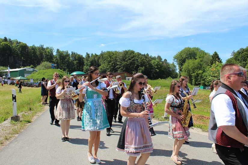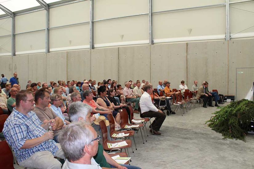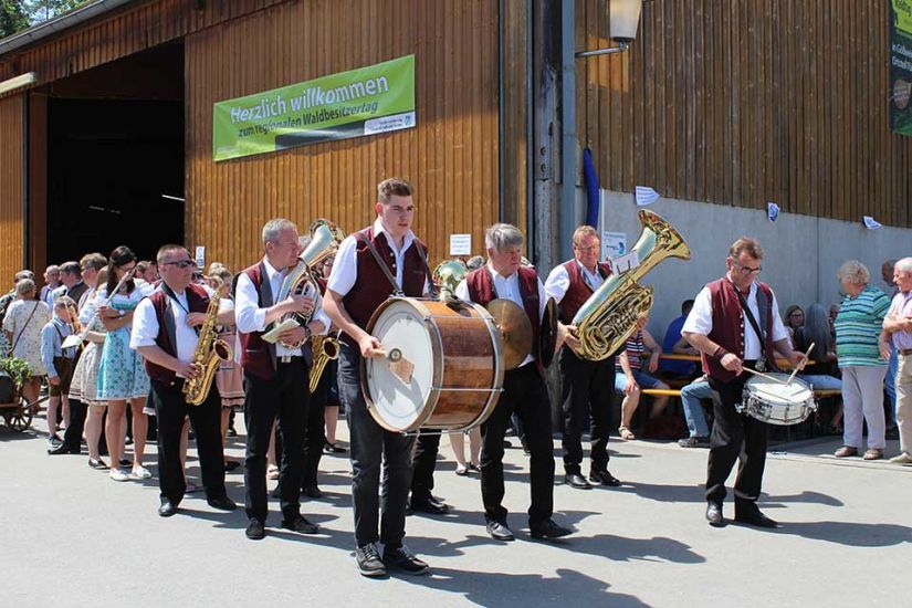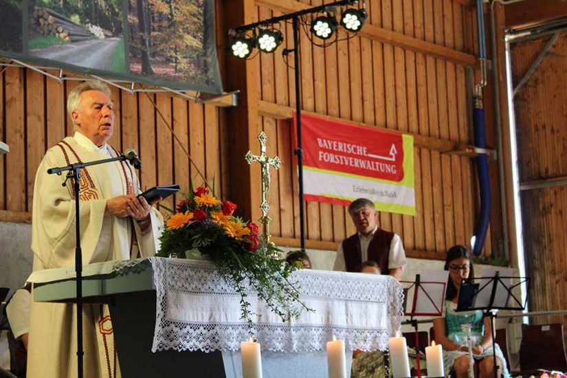 Die Sonne strahlte schon am frühen Morgen auf die Ausstellungszelte vor der großen Halle der Biogasanlage Neuner in Türkelstein. Drinnen hatten sich bereits zahlreiche Waldbesitzer einen schattigen Platz gesucht und auf den Beginn des ökumenischen Gottesdienstes gewartet. Der Musikverein Gößweinstein leutete mit fröhlichen Klängen den Regionalen Waldbesitzertag 2019 ein. Pater Rigobert Beck machte im Gottesdienst auf die große Verantwortung der Waldbesitzer aufmerksam: „Die Waldbesitzer haben einen wesentlichen Anteil daran, die Schöpfung und das Klima in Einklang zu bringen.“ Pfarrer Michael Maul predigte: „Lasst die Vielfalt des Lebens einziehen“, denn diese Vielfalt täte den Menschen, sowie den Wäldern gut.