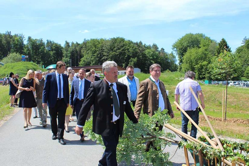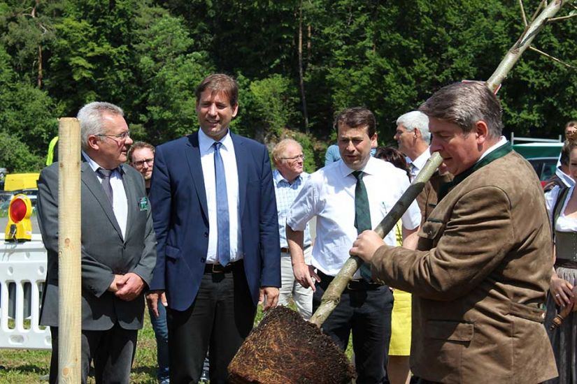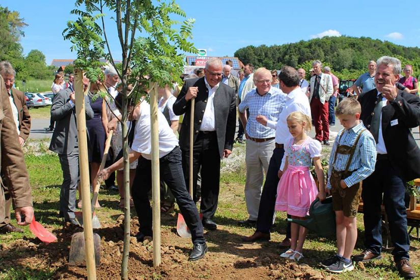 Gemeinsam mit den Vorsitzenden der WBV Fränkische Schweiz, Ludwig Thiem und Heinz Pöhlmann, pflanzten die Ehrengäste einen Speierling vor die Tore der Biogasanlage. Der Baum soll die Familie Neuner noch lange an den Regionalen Waldbesitzertag und vor allem an den hohen Besuch auf ihrem Hof erinnern. „Der Speierling gilt als Hoffnungsträger im Klimawandel und kann pro Jahr bis zu tausend Kilo Früchte tragen“, erklärt Matthias Jessen, vom Amt für Ernährung, Landwirtschaft und Forsten, zu dem frisch gepflanzten Baum.