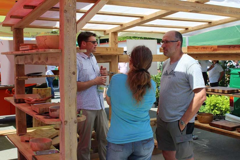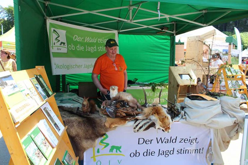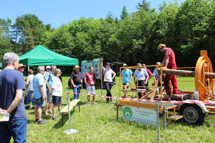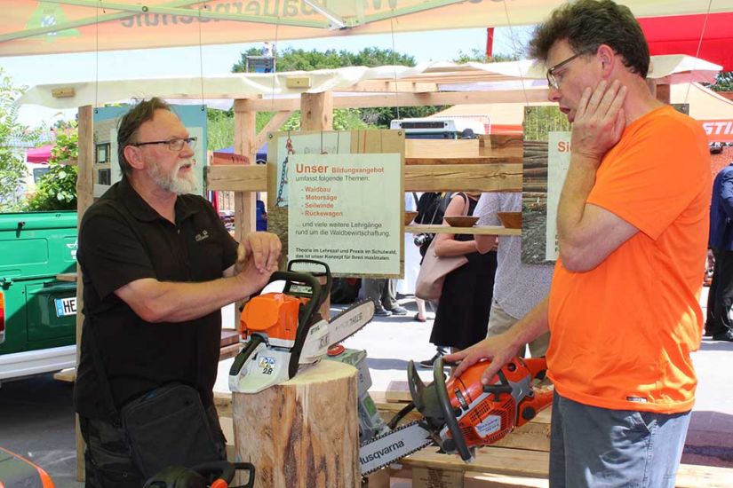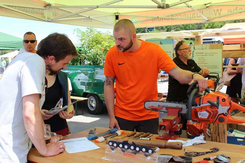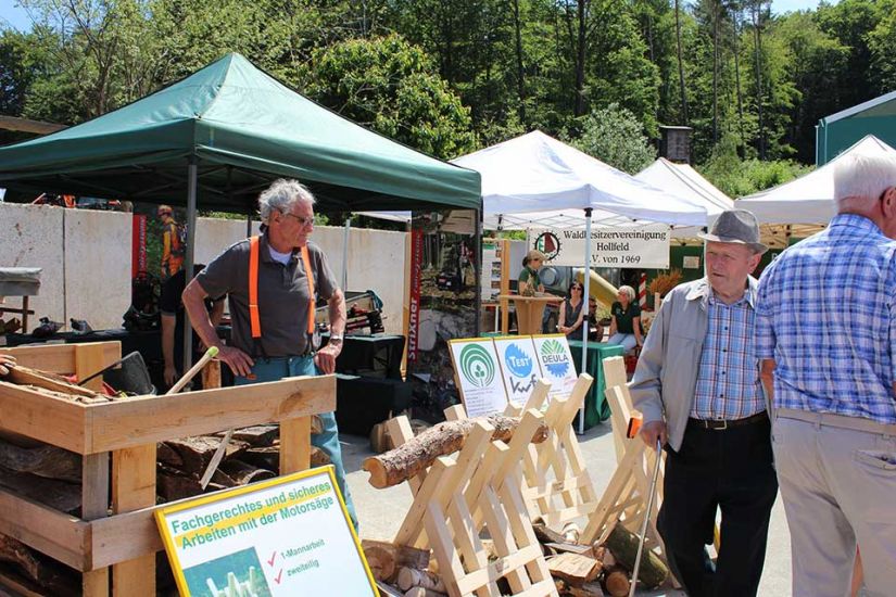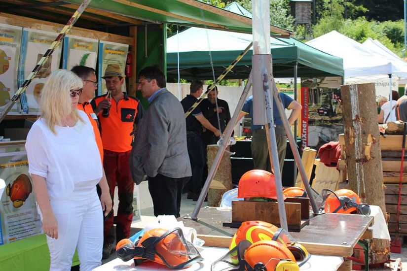 Nach der Arbeit folgte das Vergnügen und die Besucher konnten bei kühlem Bier und leckerem Essen den sommerlichen Tag in Türkelstein genießen. Wer sich über Baumarten, Motorsägen oder die verschiedenen Verbände von Waldbesitzern informieren wollte, hatte eine große Auswahl an Ausstellern vor sich. Die Sozialversicherung für Landwirtschaft, Forsten und Gartenbau demonstrierte beispielsweise anhand einer Melone und eines herabstürzenden Astes, wie wichtig es sei, bei der Waldarbeit entsprechende Schutzkleidung zu tragen. „Allein in Mittel- und Oberfranken passieren jährlich tausend Unfälle in Zusammenhang mit Waldarbeit. Wir wollen deswegen die Leute schon vorher über Sicherheitsvorkehrungen aufklären, um Unfälle zu vermeiden“, so Harald Bammler von der SVLFG.