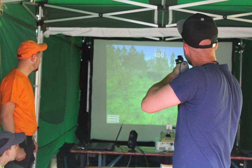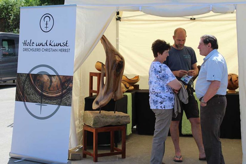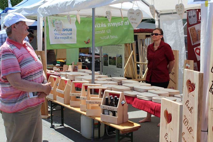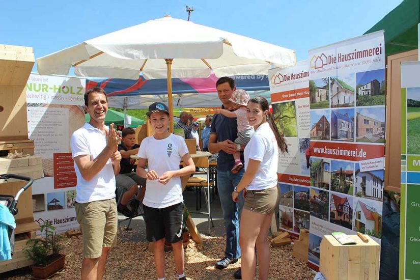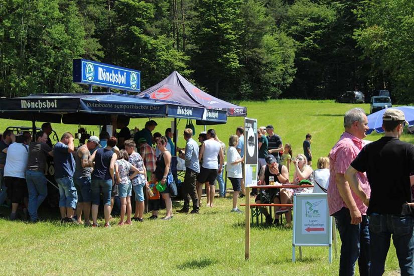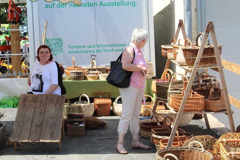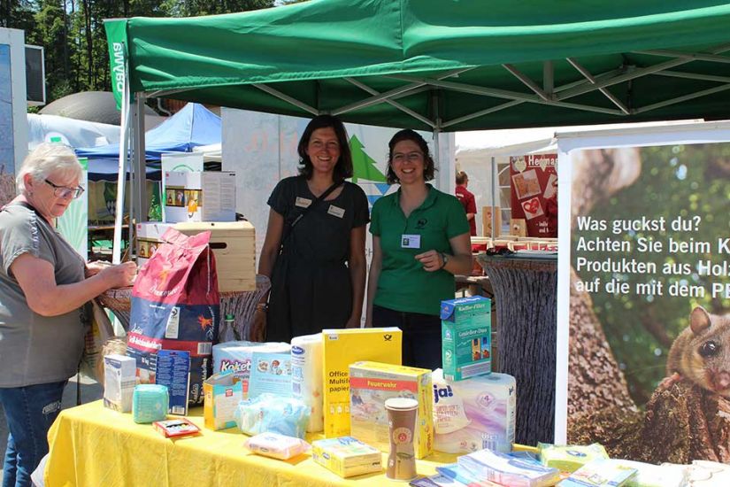 Nach der Arbeit folgte das Vergnügen und die Besucher konnten bei kühlem Bier und leckerem Essen den sommerlichen Tag in Türkelstein genießen. Wer sich über Baumarten, Motorsägen oder die verschiedenen Verbände von Waldbesitzern informieren wollte, hatte eine große Auswahl an Ausstellern vor sich. Die Sozialversicherung für Landwirtschaft, Forsten und Gartenbau demonstrierte beispielsweise anhand einer Melone und eines herabstürzenden Astes, wie wichtig es sei, bei der Waldarbeit entsprechende Schutzkleidung zu tragen. „Allein in Mittel- und Oberfranken passieren jährlich tausend Unfälle in Zusammenhang mit Waldarbeit. Wir wollen deswegen die Leute schon vorher über Sicherheitsvorkehrungen aufklären, um Unfälle zu vermeiden“, so Harald Bammler von der SVLFG.