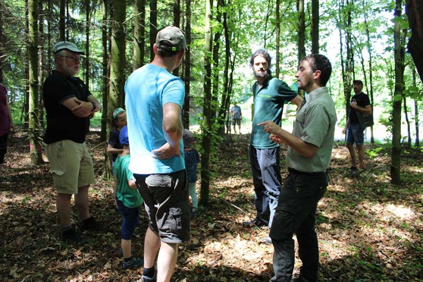Im angrenzenden Waldgebiet in Türkelstein hatte die WBV Fränkische Schweiz einen Waldparcours errichtet, an dem es bei jeder Station neues Wissen zu erlernen galt. Bei der ersten Station in einem Jungbestand waren die Bäume mit Nummern und Farben gekennzeichnet. Die Besucher sollten die Bäume auswählen, bei denen sie glaubten, dass sie sich später gut weiterverwerten ließen. „Wir zeigen hier, dass man in einem Jungbestand mit wenigen Handgriffen viel erreichen kann. Bei den einzelnen Bäumen erklären wir den Besuchern, welche Bäume man besser rausnimmt, um dem stärkeren Nachbarn Platz zu schaffen“, erklärt Daniel Schenk vom Amt für Ernährung, Landwirtschaft und Forsten.